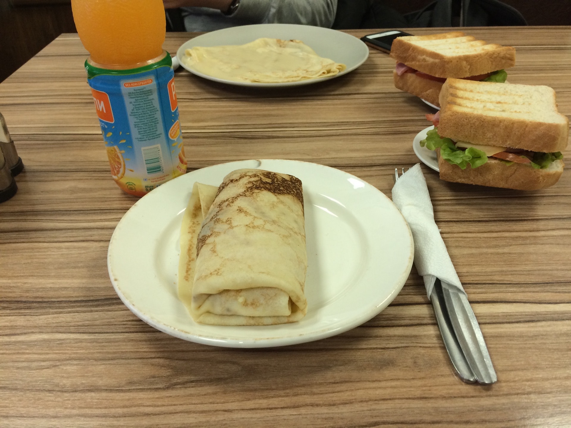 брала на вынос, приготовили быстро, блин с курицей и грибами не гуд, внутри много соуса(вероятно майонез с кетчупом), а начинки мало; а вот блин со сгущенкой ничего, но можно было его потоньше сделать